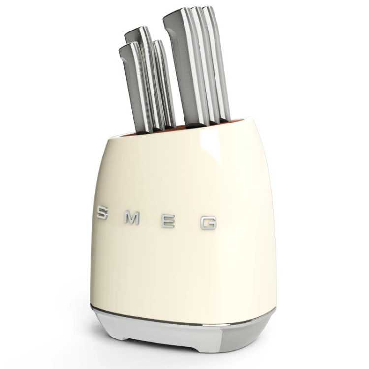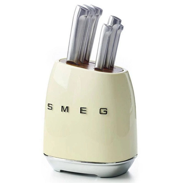 با این ست بلوک چاقو 7 تکه ، استایل کلاسیک SMEG و ظاهری قدیمی دهه 1950 را به میز آشپزخانه خود بیاورید! بلوک چاقوی چوب اقاقیا دارای بدنه بیرونی فولاد کربنی با پوشش پولیش است که به راحتی تمیز میشود و به رنگ کرم براق پوشیده شده است برای هماهنگی با سایر لوازم SMEG رنگ است.پایههای ضد لغزش مانع از لغزش بلوک در هنگام برداشتن چاقو میشوند. چاقوهای این مجموعه دارای تیغه های با کیفیت استیل ضد زنگ آلمانی و دسته های فولادی ضد زنگ صیقلی و بسیار بادوام هستند و برای کارهای روزمره برش انواع مواد غذایی آماده هستند. این مجموعه شامل چاقوی سبزیجات، چاقوی همه کاره، چاقوی گوشت، چاقوی سانتوکو، چاقوی نان و چاقوی آشپز می باشد.